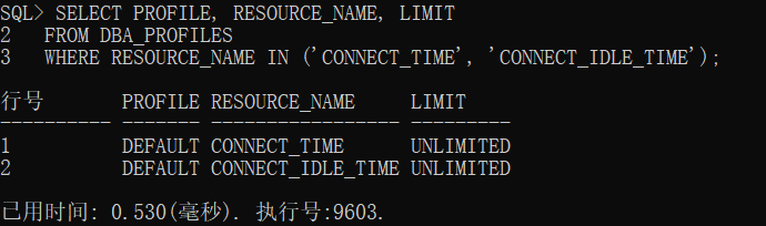 WHERE RESOURCE_NAME IN ('CONNECT_TIME', 'CONNECT_IDLE_TIME');