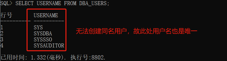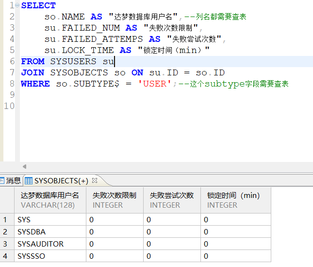 so.NAME AS "达梦数据库用户名",--列名都需要查表,so 是 SYSOBJECTS 表的别名(通过 JOIN SYSOBJECTS so 指定)。