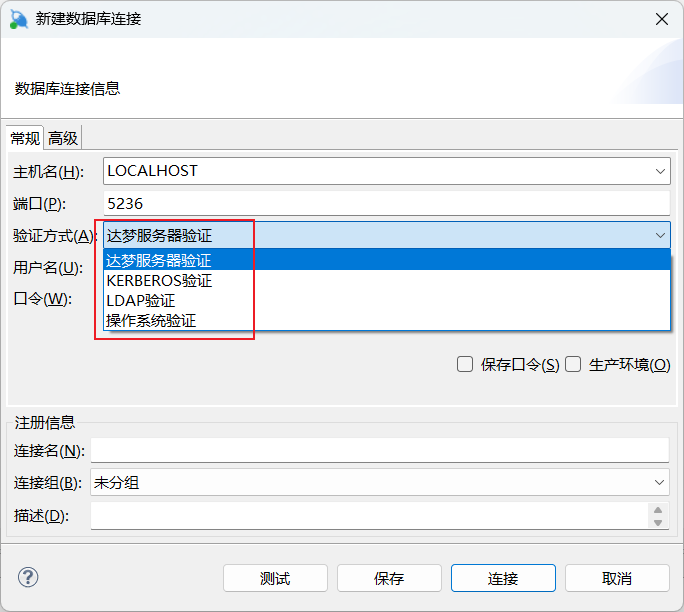 使用DM管理工具进行登录时提供了四种身份验证方式,四种身份鉴别方式均需要提供登录口令,如图: