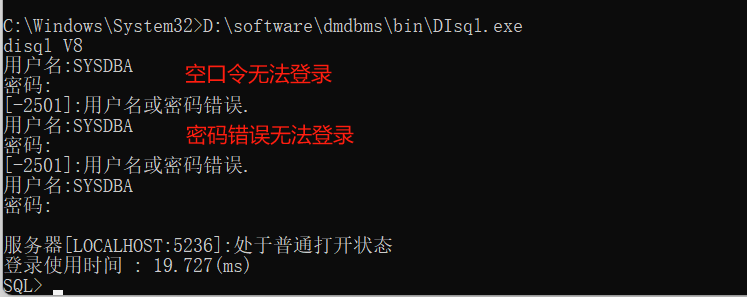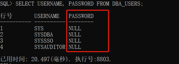 注意:使用SYSDBA查看用户表发现所有账户password字段均为NULL,通过网上查询似乎是数据库为了安全性隐藏了这些信息。在配置向导中可以配置SYSDBA用户口令为空(但是仅能通过DIsql.exe空口令登录),使用SYSDBA创建其他普通账户时强制要求了口令,其他管理账户默认均有口令,建议手动测试账户是否配置了登录口令。