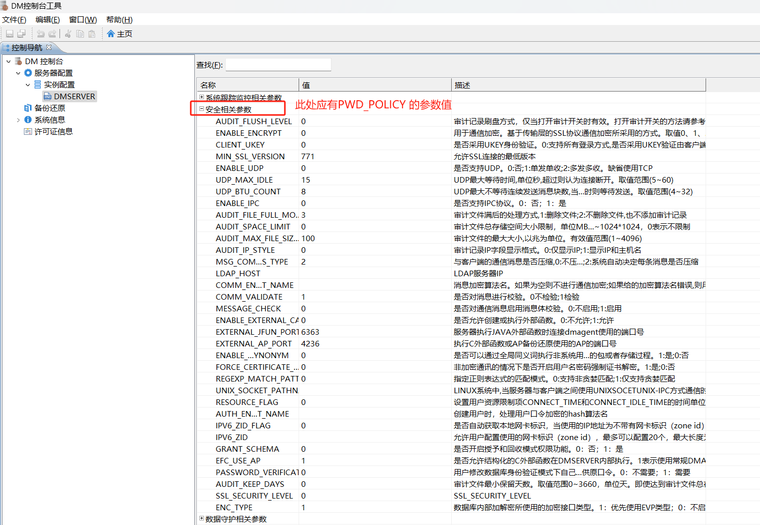 口令策略:除了在创建用户语句中指定该用户的口令策略,DM 的 INI 参数 PWD_POLICY 可以指定系统的默认口令策略,缺省值为 ≥2。