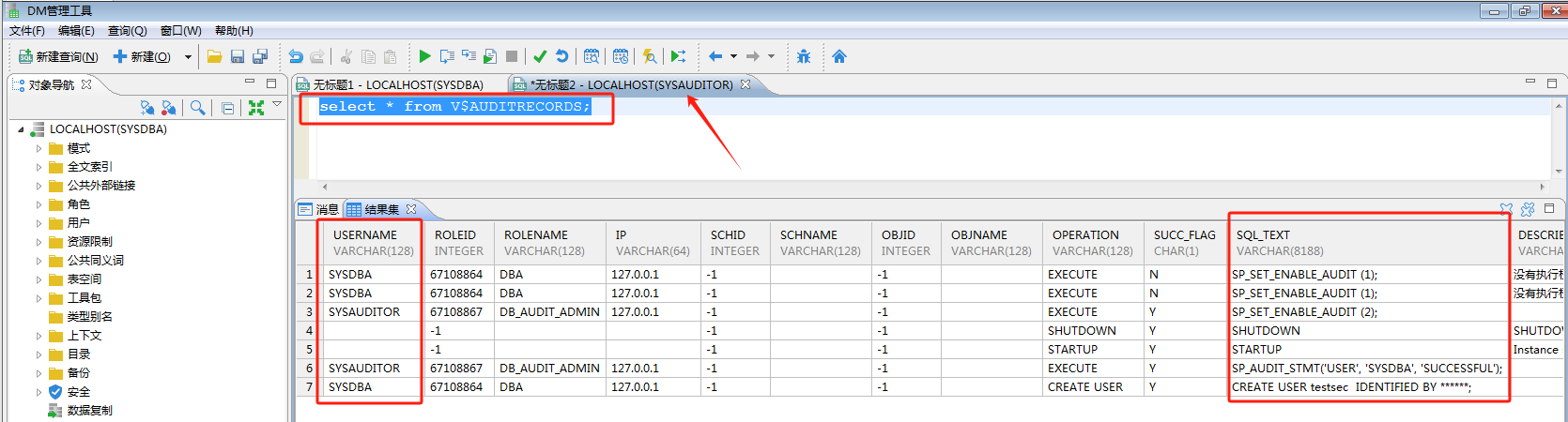 开启ENABLE_AUDIT以及针对语句级查询后查看日志记录;