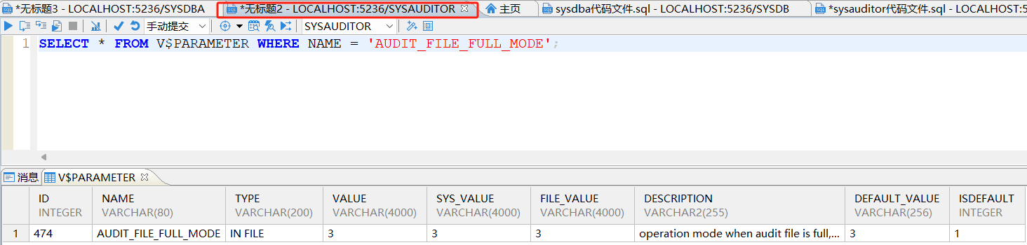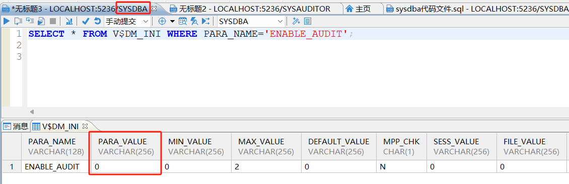 使用数据库数据库审计员查询审计开关当前的值: