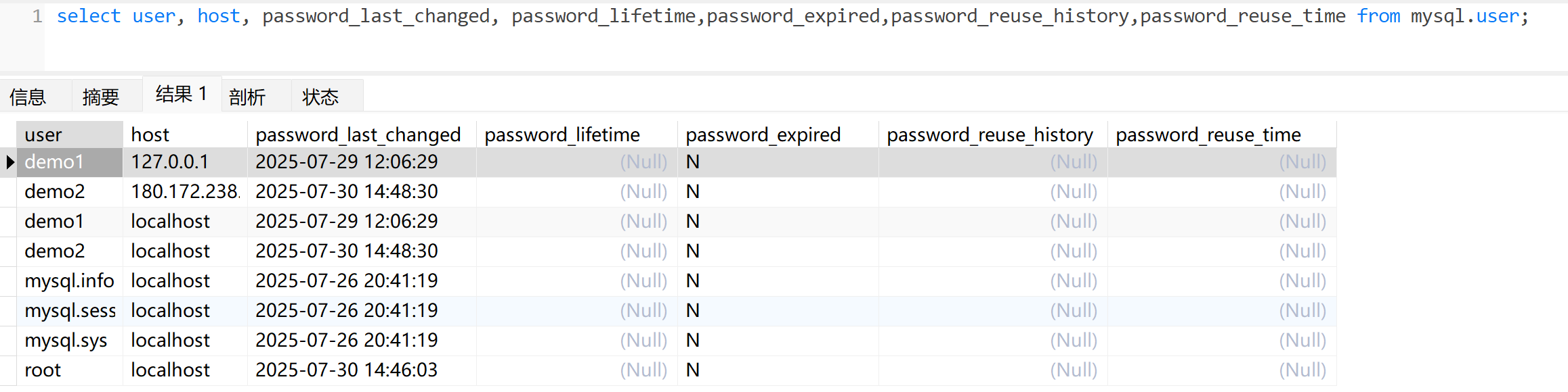 select user, host, password_last_changed, password_lifetime,password_expired,password_reuse_history,password_reuse_time from mysql.user;