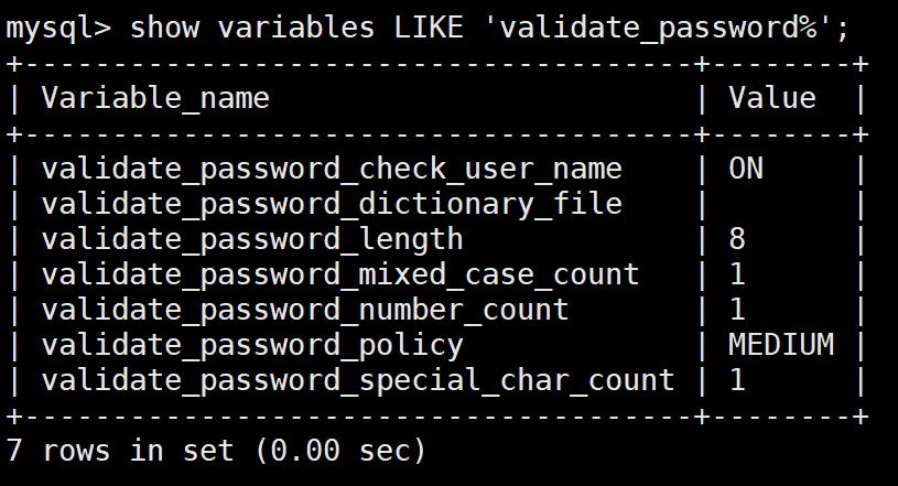 (4)执行“show variables like ‘validate’”、“show VARIABLES like “%password%””命令,查看用户口令复杂度的相关配置。核查注意:MySQL账户通常无法重复,账户名具有唯一性。